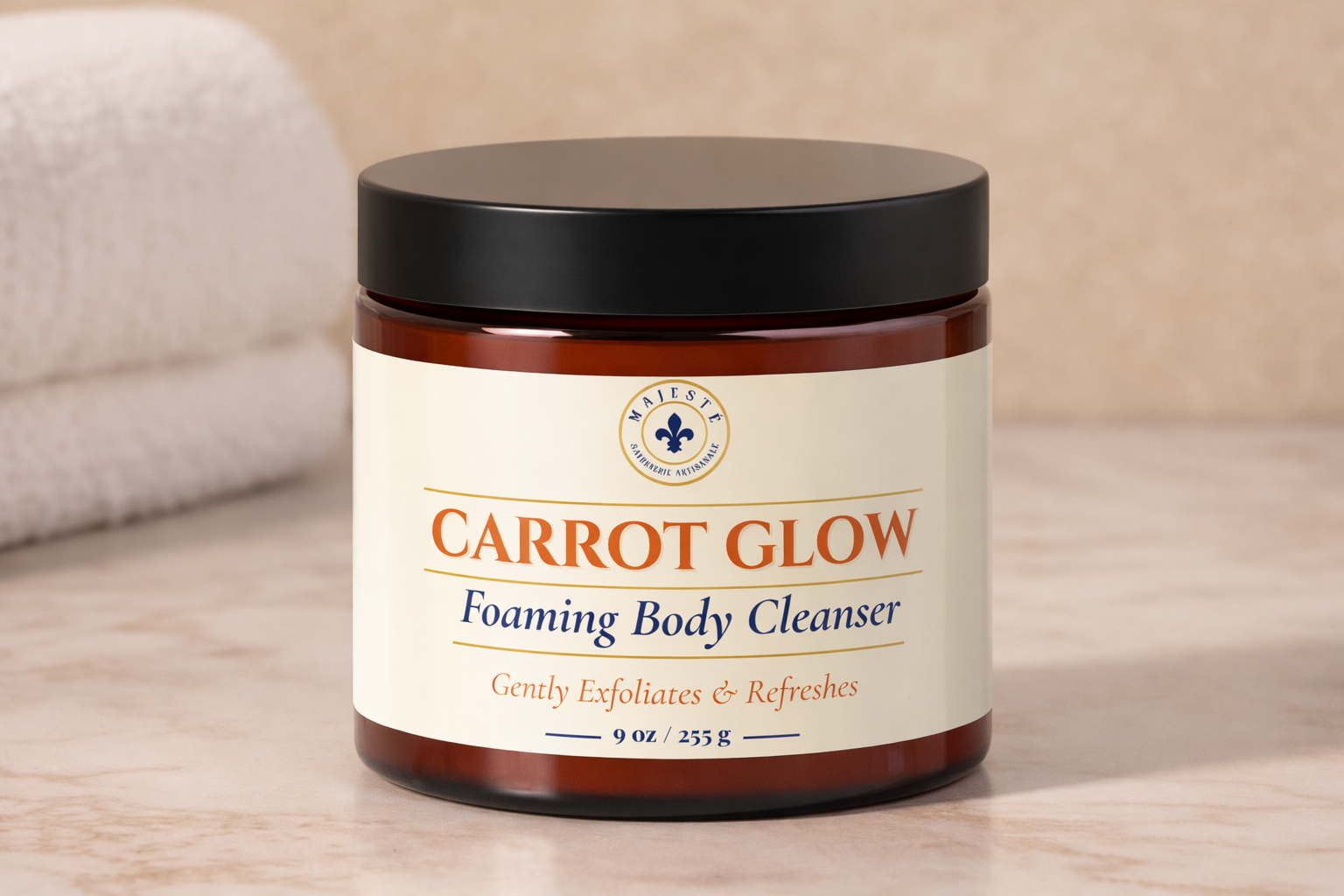 Reveal smoother, more radiant skin with the Majesté Carrot Glow Foaming Body Cleanser—a gentle exfoliating cleanser designed to refresh, polish, and brighten the skin in one effortless step.